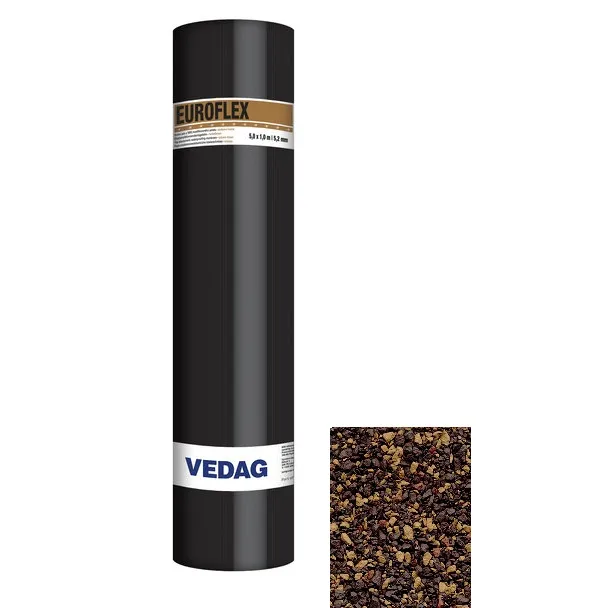 Nosná vložka: Netkaná polyesterová rohož Hlavní použití Plochá střecha Typ pásu: Vrchní pás Délka: 5 m Tloušťka: 5,2 mm Šířka: 1 m Horní povrch: Hrubozrnný břidličný posyp: modrozelený, hrubozrnný granulovaný posyp: podzimní hněď, podélný přesah krytý stahovací fólií Ohebnost za studena: -25 °C Spodní povrch: Separační spalná fólie Barva: podzimní hněď Způsob pokládky: Natavení