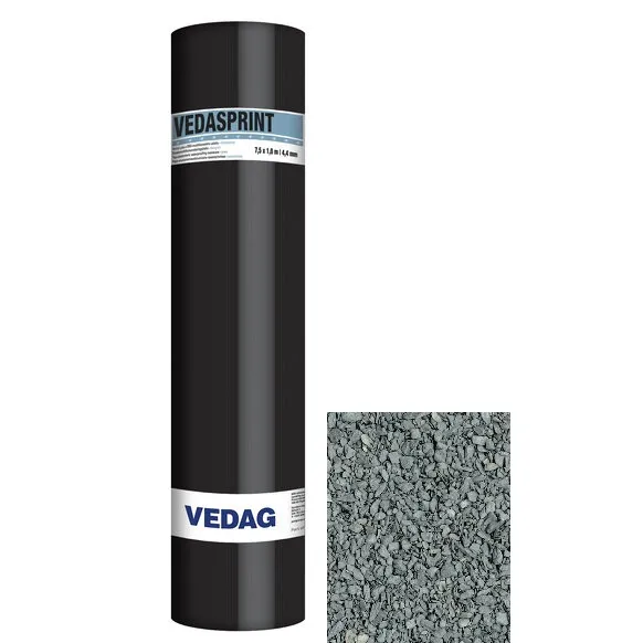 Horní povrch: Hrubozrnný břidličný posyp: modrozelený, hrubozrnný keramický granulát: červený, podzimní hněď podélný přesah krytý spalnou fólií