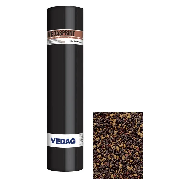 Nosná vložka: Netkaná polyesterová rohož Hlavní použití: Plochá střecha Typ pásu: Vrchní pás Délka: 7,5 m Tloušťka: 4,4 mm Šířka: 1 m Horní povrch: Hrubozrnný břidličný posyp: modrozelený, hrubozrnný keramický granulát: červený, podzimní hněď podélný přesah krytý spalnou fólií Ohebnost za studena: -25 °C Spodní povrch: Separační spalná fólie Barva: podzimní hněď Způsob pokládky: Natavení
